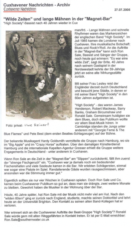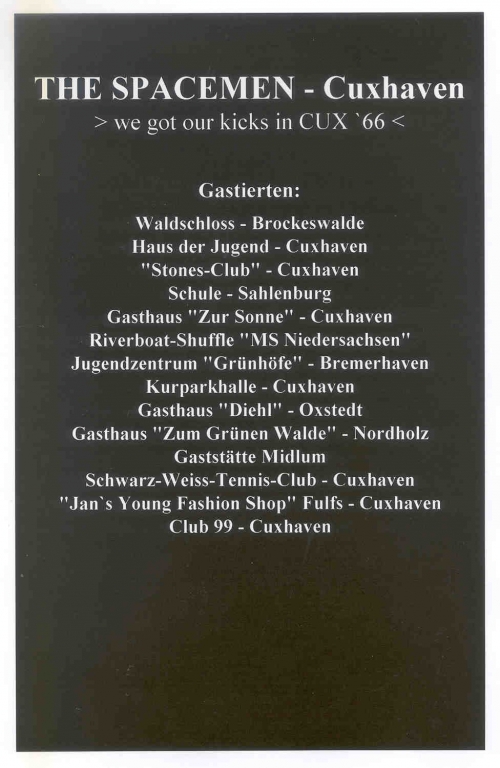 Die damalige Amateurband, die das Schicksal vieler Bands hatte und sich nach dem Abitur in alle Winde verstreute, hat sich nach über 36 Jahren noch mal aufgerafft und spielt bei unterschiedlichen Gelegenheiten in Bremen und umzu. Cream und andere Cover aus der Zeit gehören zu Ihren Auftritten. Das Bild habe ich auf der Seite der "Bremer Bands" (siehe unsere Links) gefunden. Gehe mal davon aus, dass die Jungs und Mädels nicht böse sind wenn wir dieses Bild von 1968, geschossen in der Lila Eule Bremen, bei uns veröffentlichen.  Vielleicht sieht und hört man die Jungs ja mal in nächster Zeit auch mal in unserer Gegend?